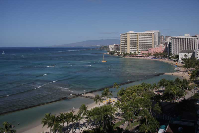 Waikiki Beach. Our hotel was at the southeast end of the long string of big hotels on