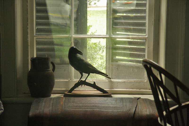raven sits perched in Poe's preserved dorm room ... can you hear him? .... "Nevermore".